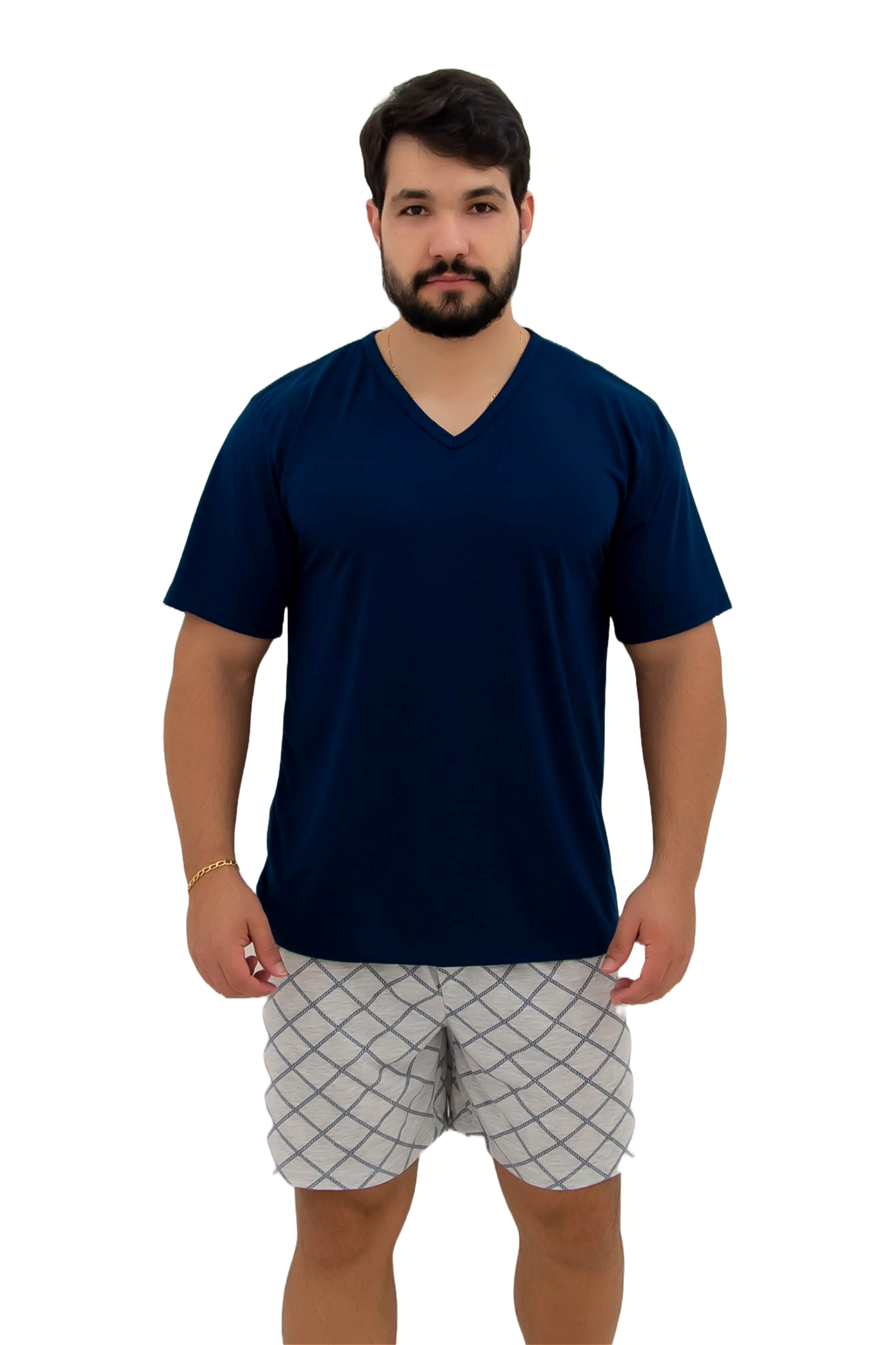 Este modelo masculino tem a blusa lisa na cor azul marinho com decote V e o short estampado.
